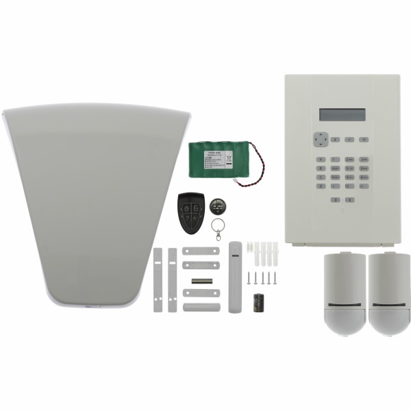 Compact electrician’s kit containing 1x PIR, 1x keyfob, 1x blue sounder with white cover